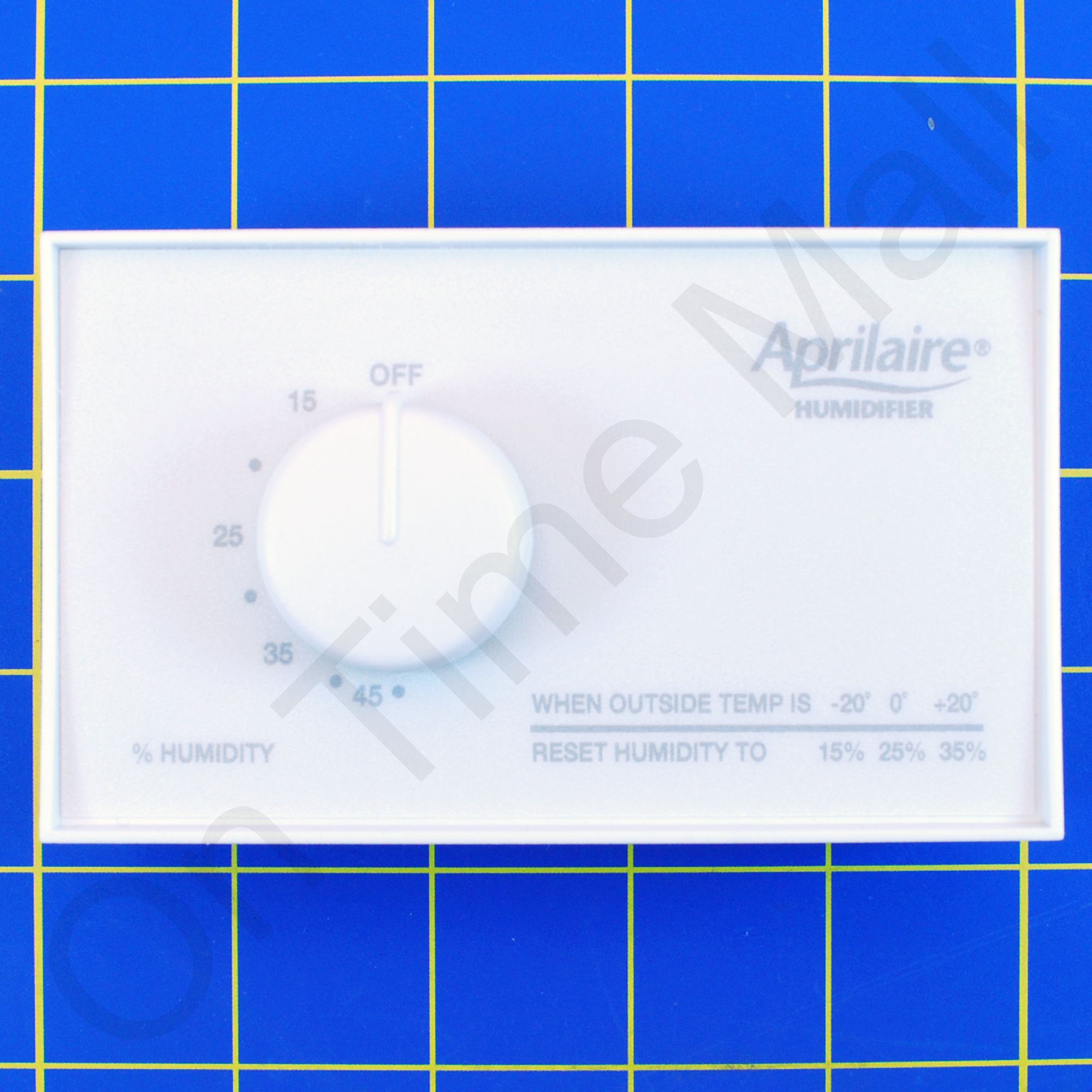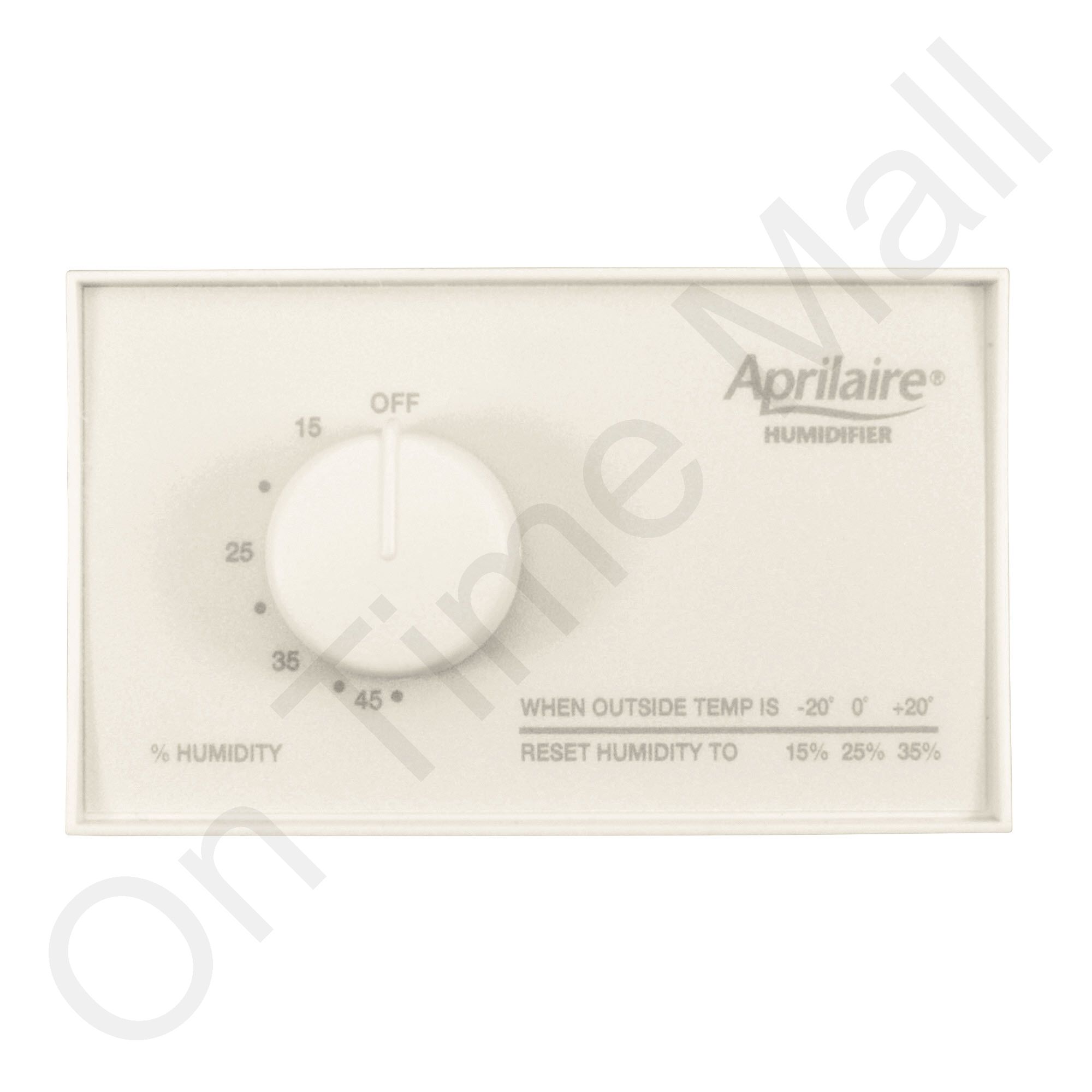 AprilAire brand wall mount analog humidistat. It can be duct mounted by using the duct mount adapter plate part number 4039 (not included). We will work on any brand of humidifier or low-voltage control system. It is designed for 24-volt operation and is rated at 5.2 amps. The setpoint range is 15% to 50%, with an 8% differential. Also known as part number 8833218. NOTE: This humidistat has been discontinued and is out of production.