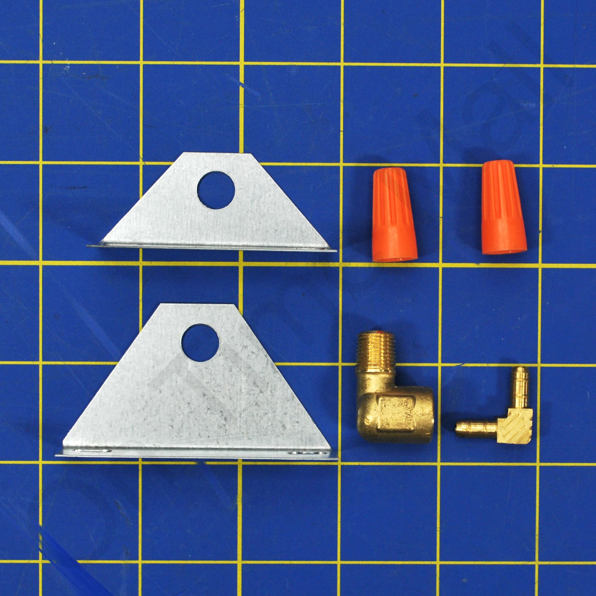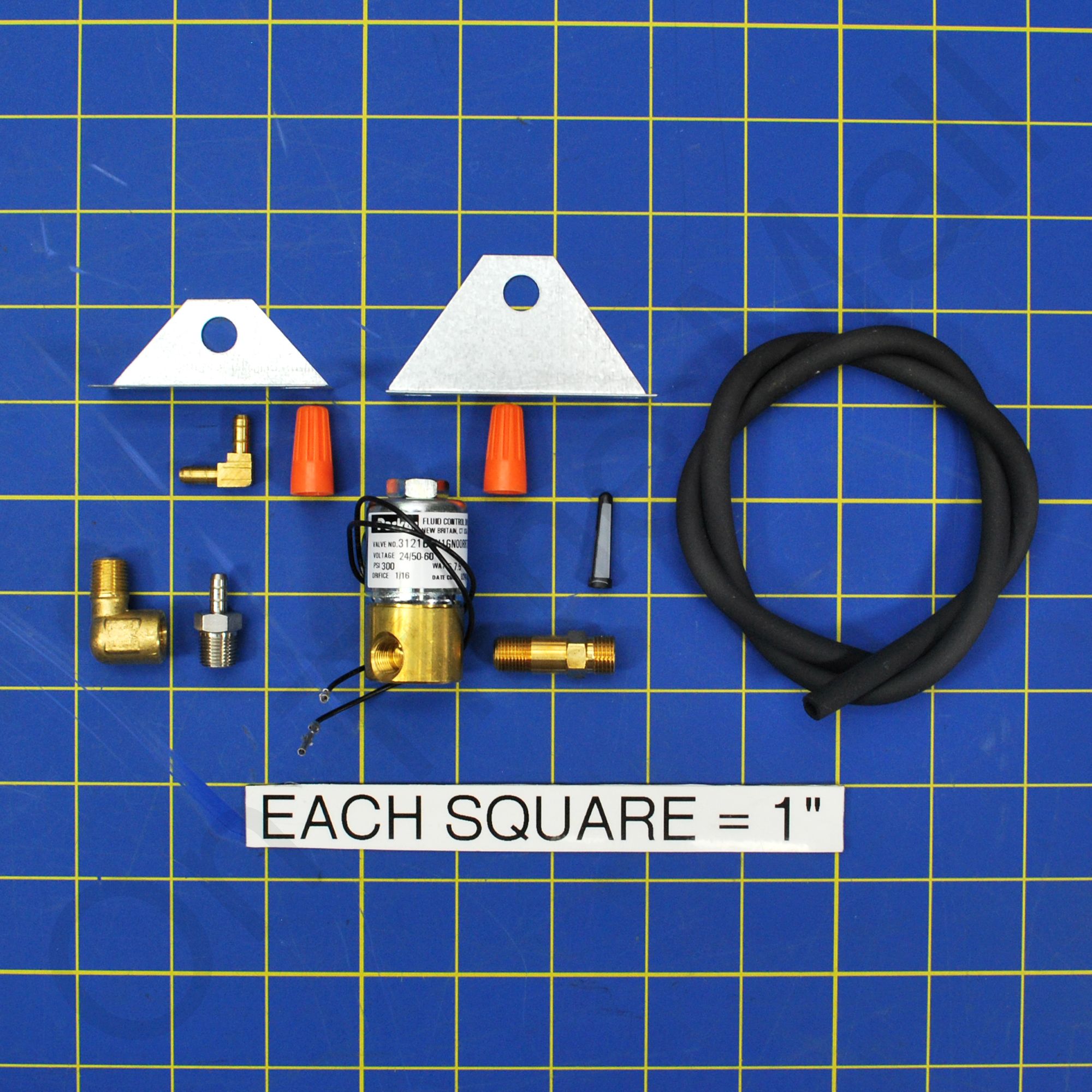 Kit includes; brass fittings, hose, strainer screen, orifice, solenoid valve, and two mounting plates.